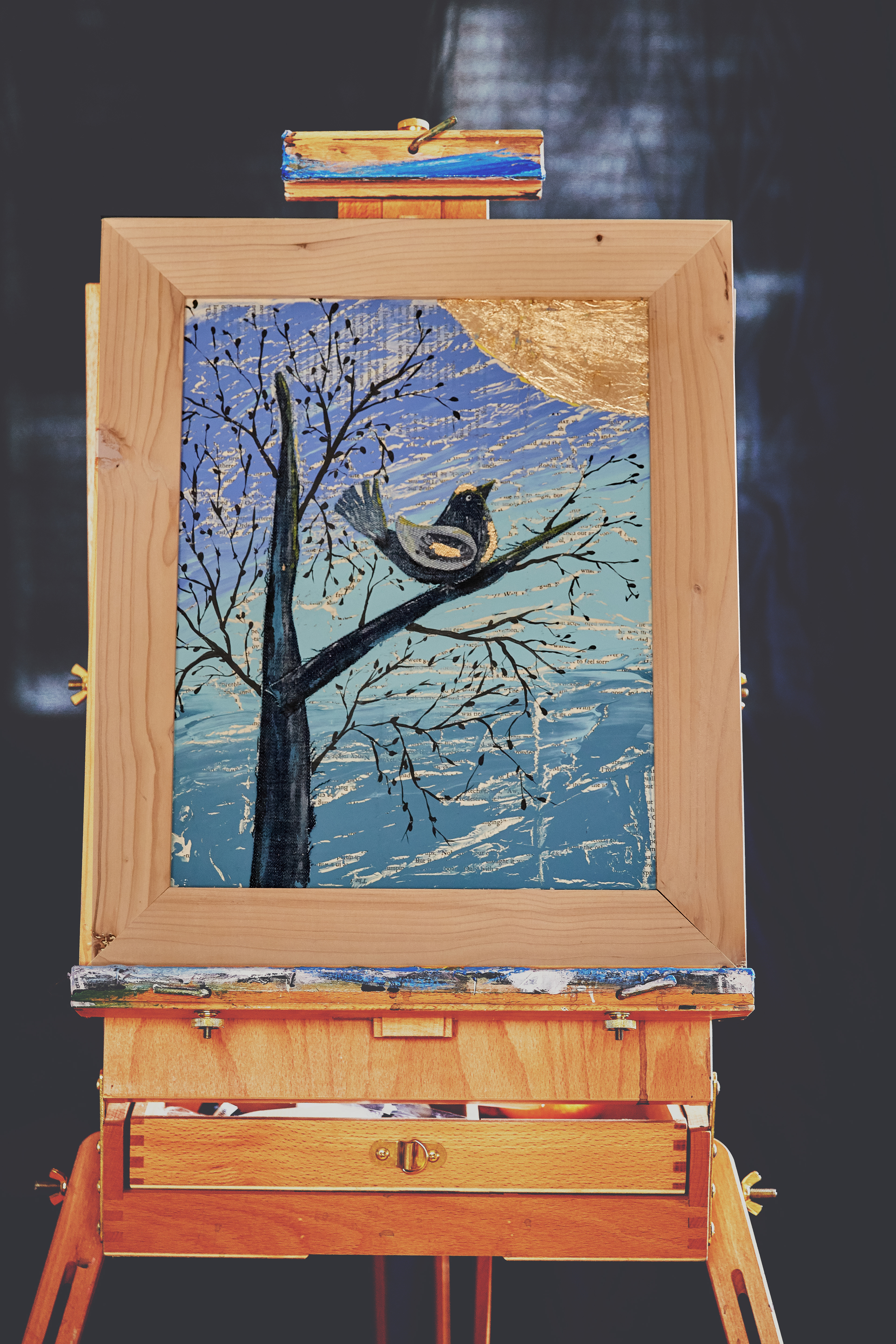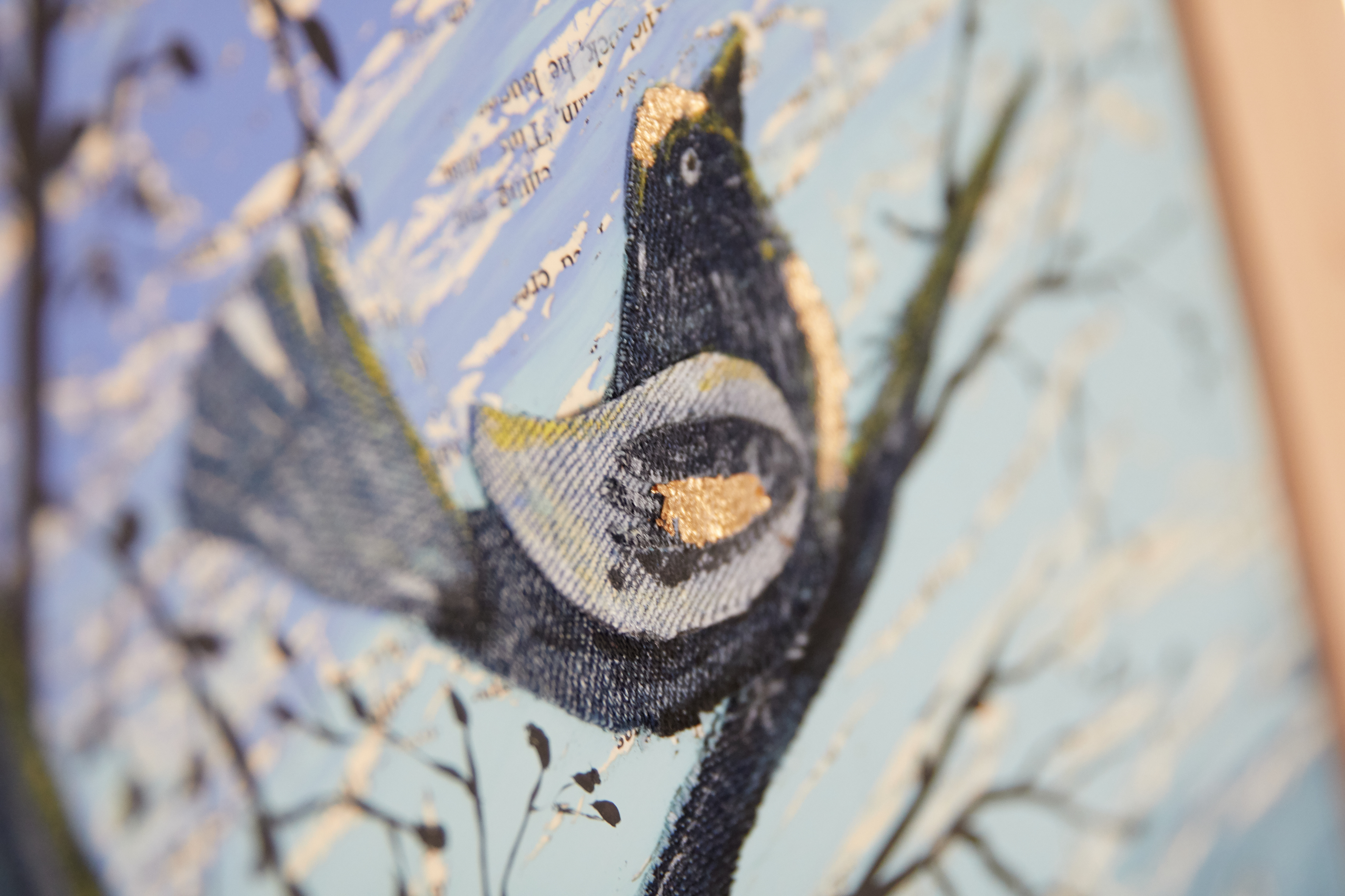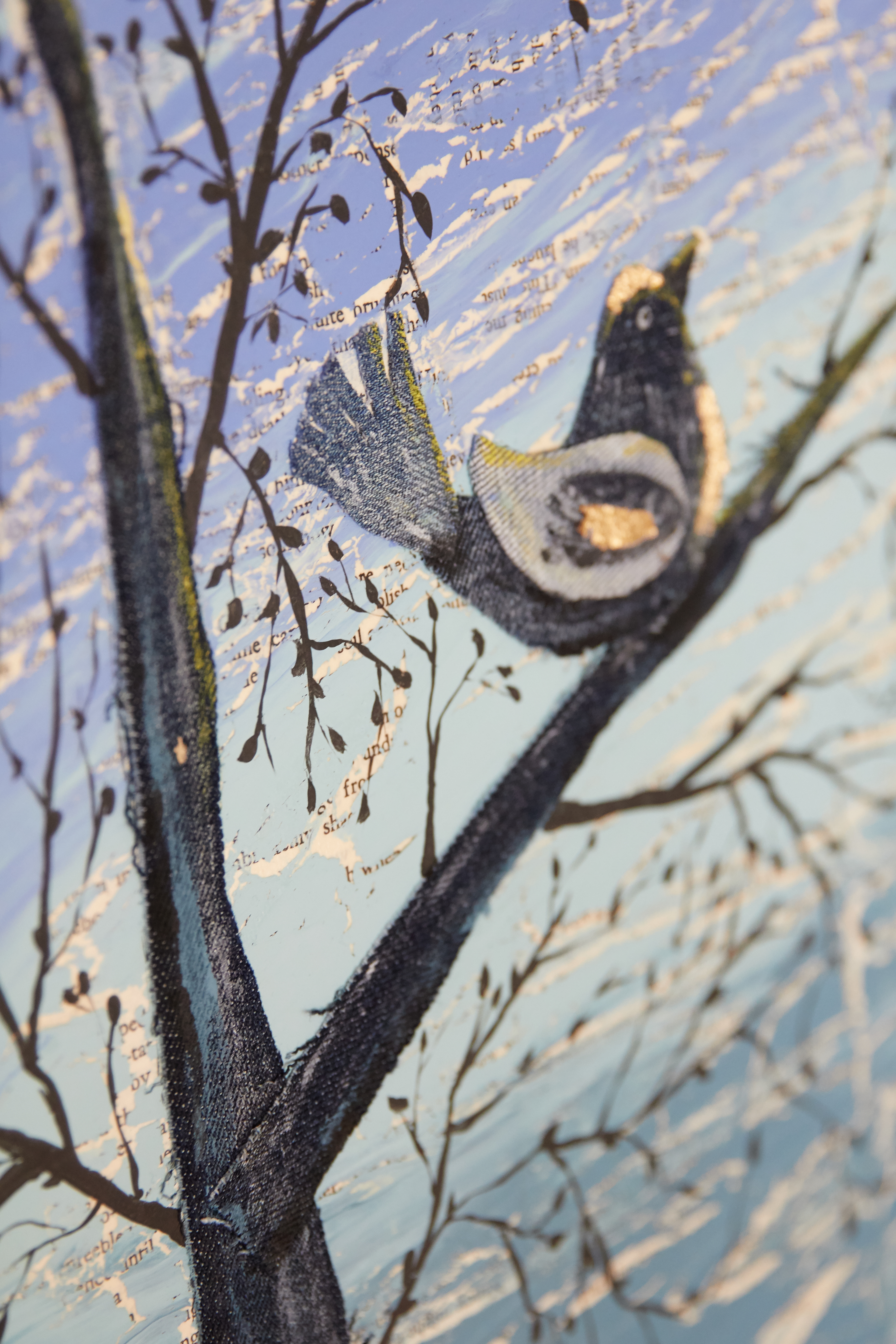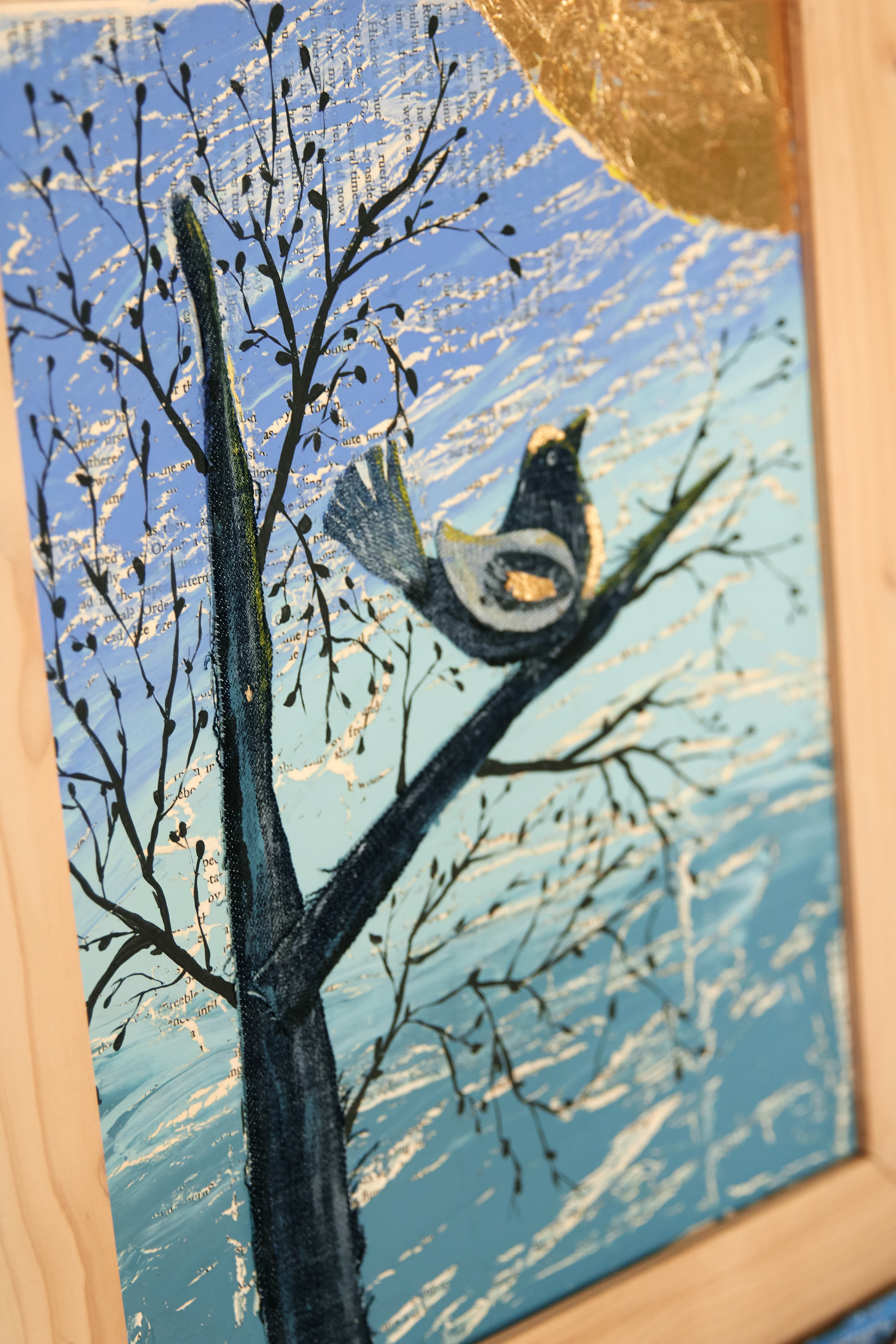 Mixed media acrylic on canvas with denim and paper