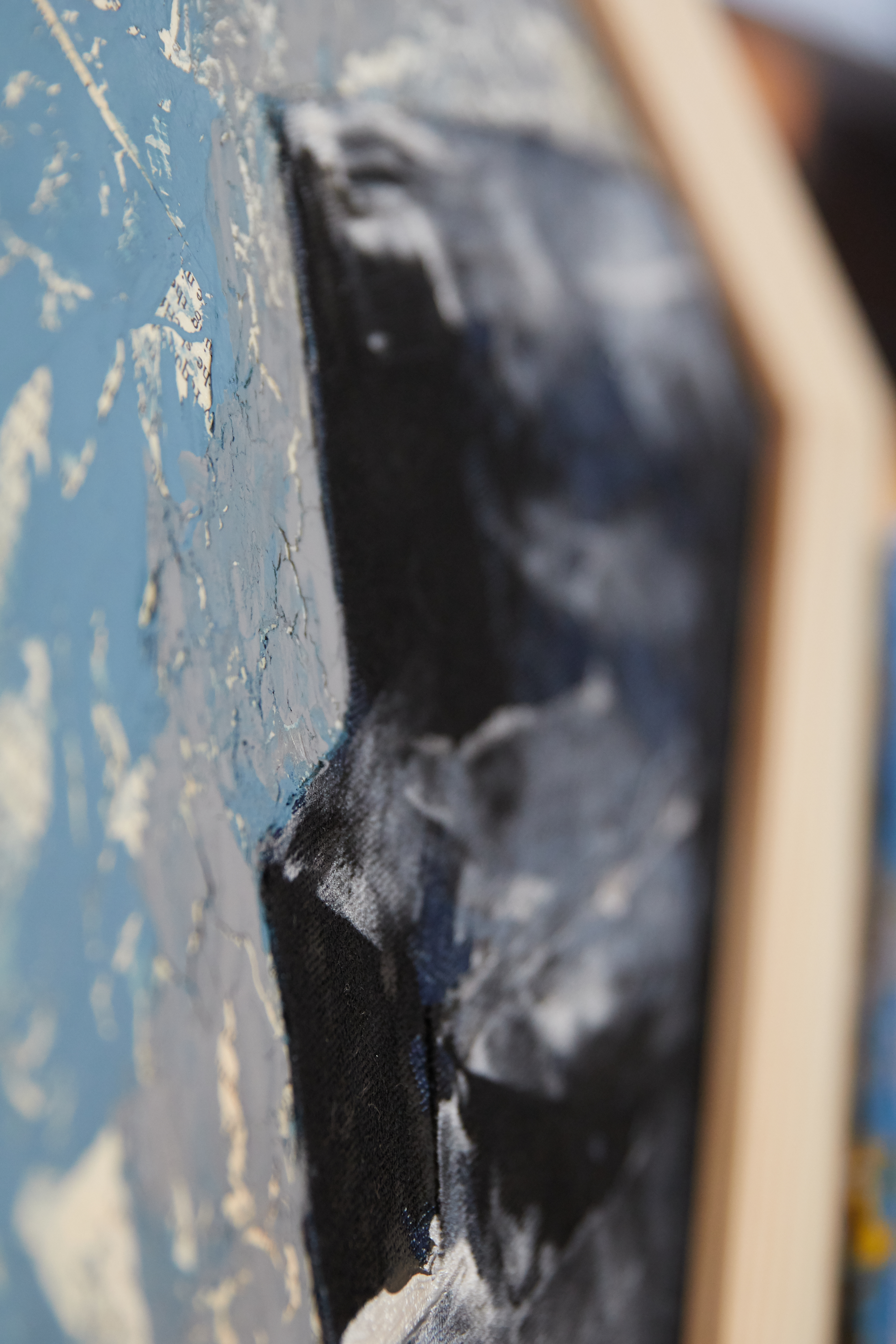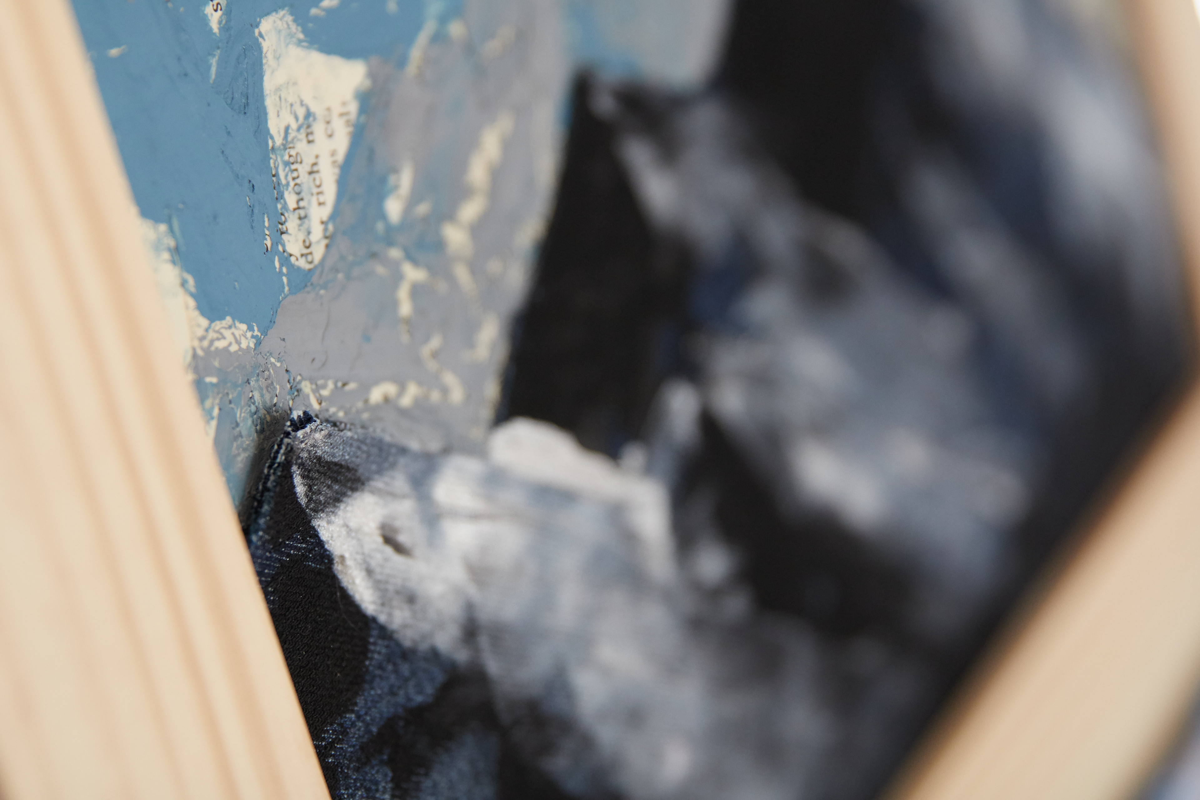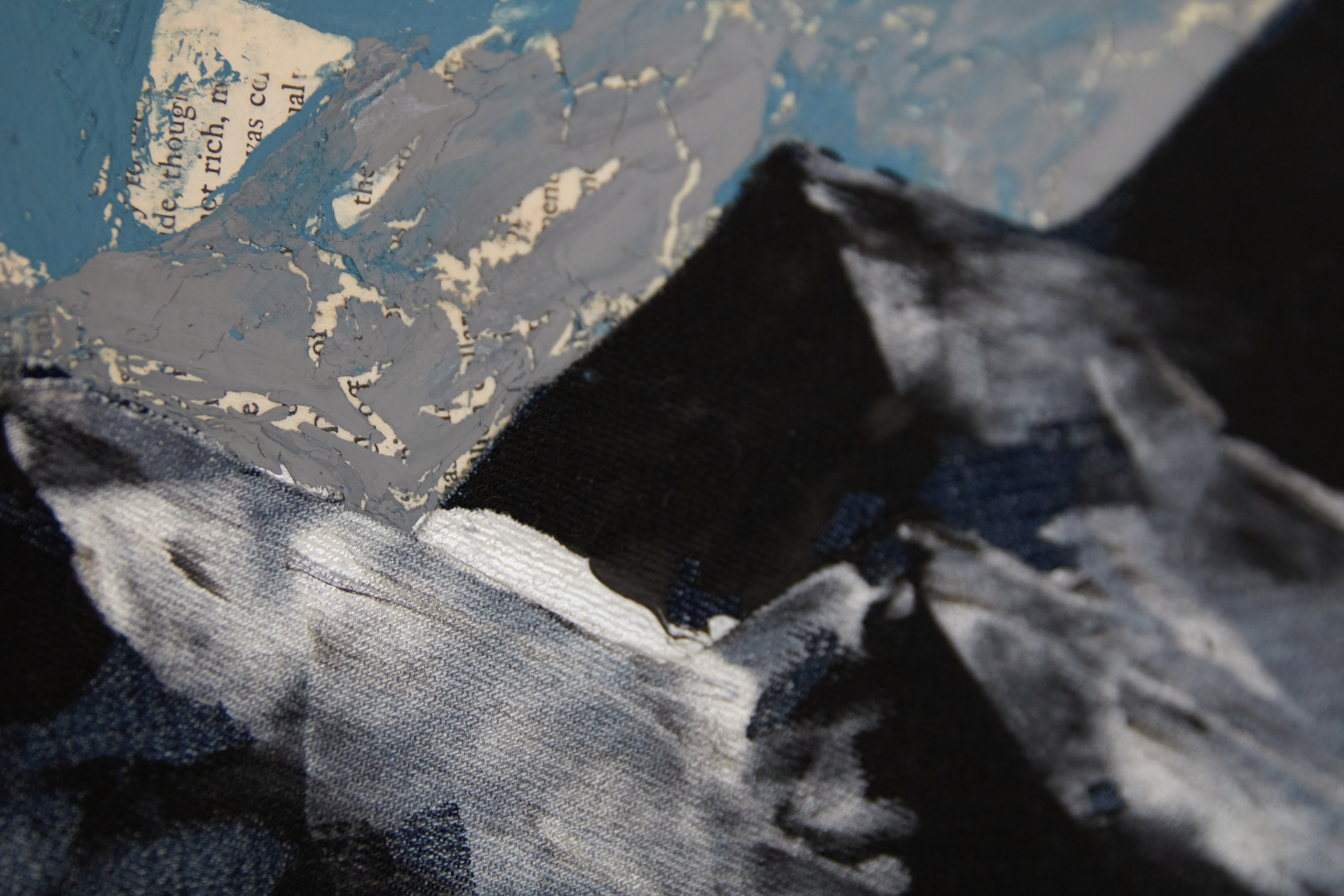 Acrylic on canvas with denim and book pages